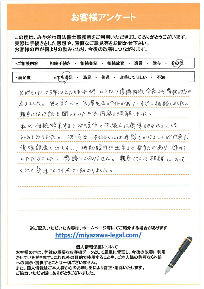 当事務所では、最初の相談時から司法書士が直接対応することで、依頼者の疑問や不安を取り除き、安心して手続きできるようにサポートいたします。